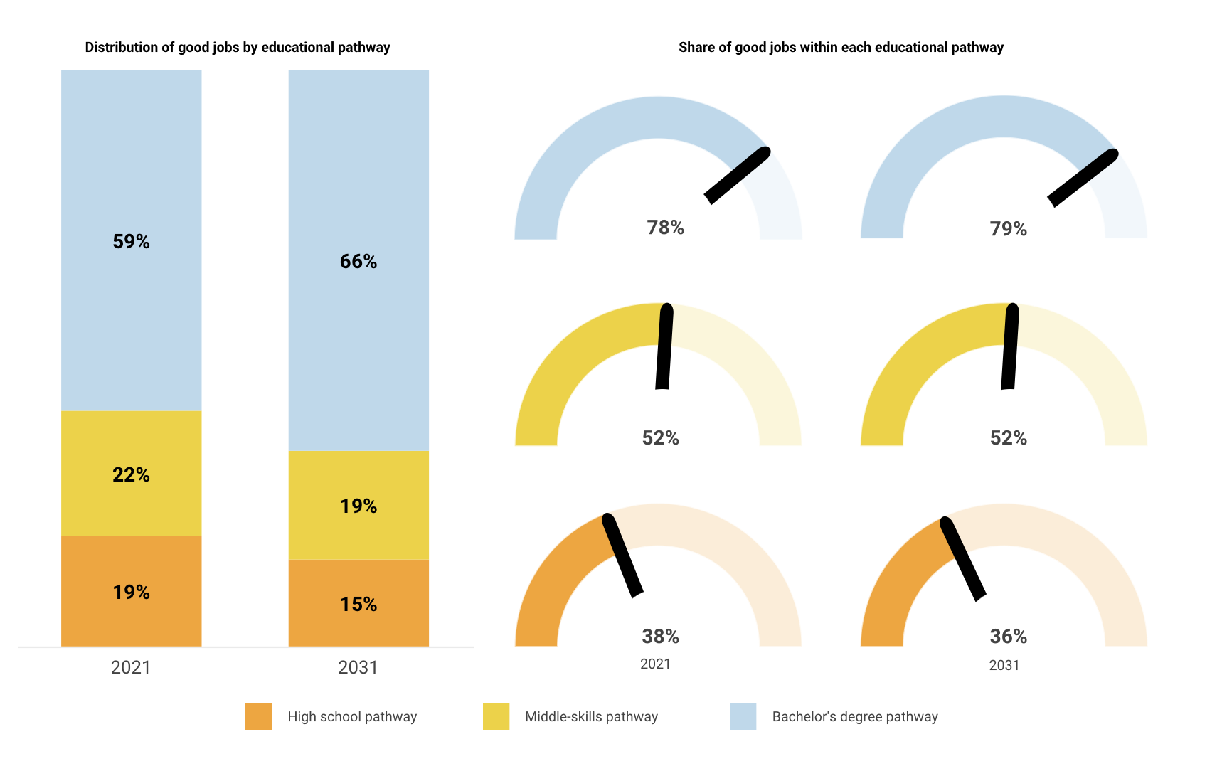 As demand for more education and skills increases, upskilling will continue to be evident through both increasing demand for higher-skilled workers within occupations and the faster growth of occupations that demand workers with higher levels of education. These dynamics will continue to shift opportunity to the bachelor’s degree and middle-skills pathway. By 2031, only 36% of all jobs on the high school pathway will be good compared to 79% on the bachelor’s degree pathway and 52% on the middle-skills pathway.