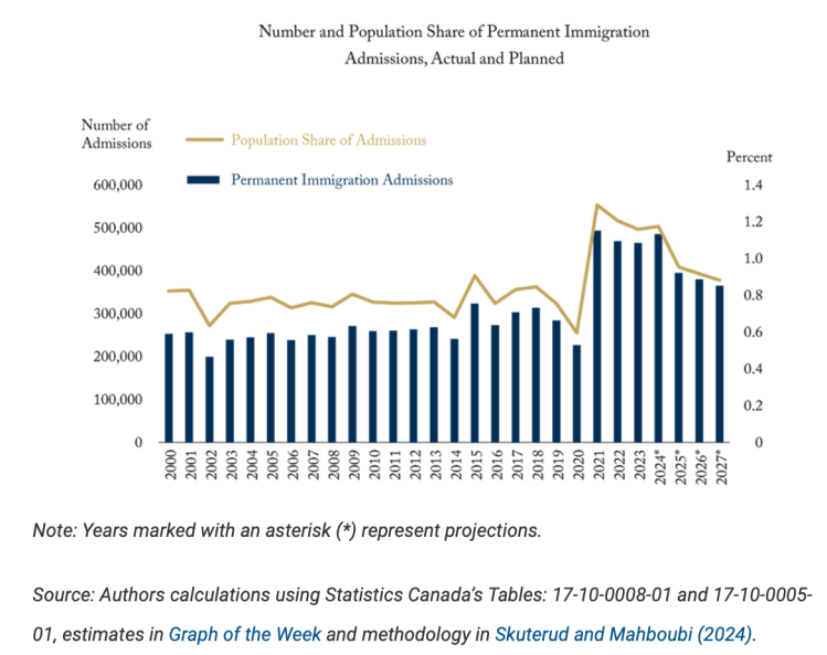 A more meaningful comparison is the two decades before the pandemic – when Canada’s immigration rate averaged 0.77 percent of the population (around 262,000 permanent residents annually).