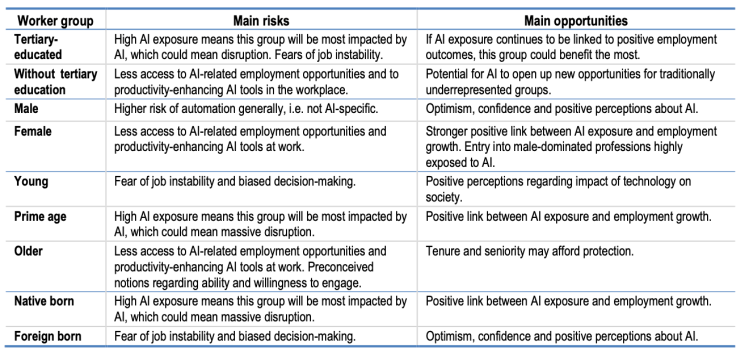 This paper examines how different socio-demographic groups experience AI at work. As AI can automate non-routine, cognitive tasks, tertiary-educated workers in “white-collar” occupations will likely face disruption, even if empirical analysis does not suggest that overall employment levels have fallen due to AI, even in “white-collar” occupations. The main risk for those without tertiary education, female and older workers is that they lose out due to lower access to AI-related employment opportunities and to productivity-enhancing AI tools in the workplace. By identifying the main risks and opportunities associated with different socio-demographic groups, the ultimate aim is to allow policy makers to target supports and to capture the benefits of AI (increased productivity and economic growth) without increasing inequalities and societal resistance to technological progress.
