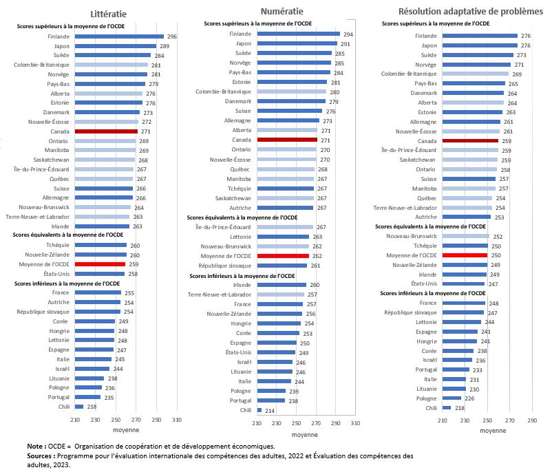 Au sein des 27 pays participants de l’OCDE, le Canada s’est classé parmi les 10 premiers dans les trois domaines de compétence du PEICA de 2022. Les scores des pays allaient de 218 à 296 en littératie, de 214 à 294 en numératie et de 218 à 276 en résolution adaptative de problèmes. Dans tous les domaines, la Finlande et le Japon ont toujours été les deux pays affichant les scores les plus élevés.