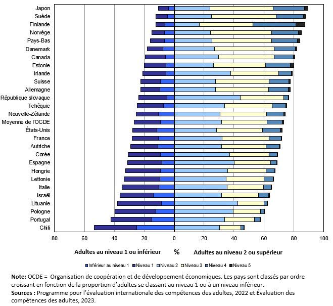 Les compétences des Canadiens de 16 à 65 ans en littératie, en numératie et en résolution adaptative de problèmes étaient supérieures à la moyenne des 27 pays de l’Organisation de coopération et de développement économiques (OCDE) participant au Programme pour l’évaluation internationale des compétences des adultes (PEICA) de 2022.