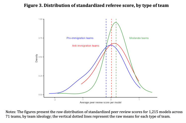 Interestingly, teams with extreme ideological stances—whether pro- or anti-immigration—tended to produce lower-quality models, as evidenced by peer referee scores. Conversely, moderate teams were more likely to adopt higher-quality research designs, producing results that garnered higher peer evaluations.