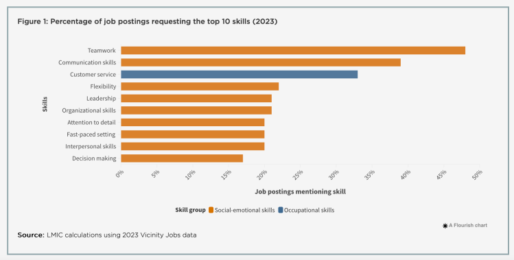 Social-emotional (or soft) skills account for nine of the 10 most frequently requested skills. Customer service (primarily associated with sales and service roles) is the only occupational skill among the top 10.
