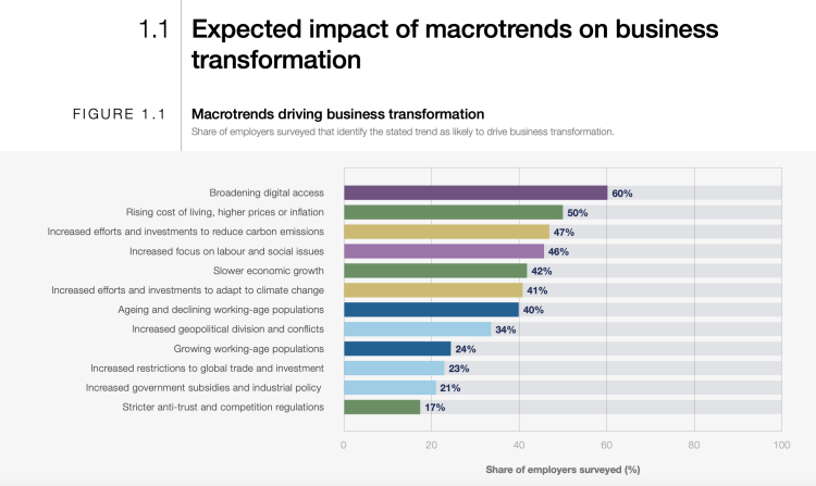 Increasing cost of living ranks as the second- most transformative trend overall – and the top trend related to economic conditions – with half of employers expecting it to transform their business by 2030, despite an anticipated reduction in global inflation. General economic slowdown, to a lesser extent, also remains top of mind and is expected to transform 42% of businesses. Inflation is predicted to have a mixed outlook for net job creation to 2030, while slower growth is expected to displace 1.6 million jobs globally. These two impacts on job creation are expected to increase the demand for creative thinking and resilience, flexibility, and agility skills.
