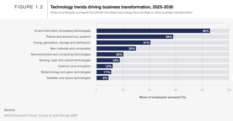 Broadening digital access is expected to be the most transformative trend – both across technology-related trends and overall – with 60% of employers expecting it to transform their business by 2030. Advancements in technologies, particularly AI and information processing (86%); robotics and automation (58%); and energy generation, storage and distribution (41%), are also expected to be transformative. These trends are expected to have a divergent effect on jobs, driving both the fastest-growing and fastest-declining roles, and fueling demand for technology-related skills, including AI and big data, networks and cybersecurity and technological literacy, which are anticipated to be the top three fastest- growing skills.