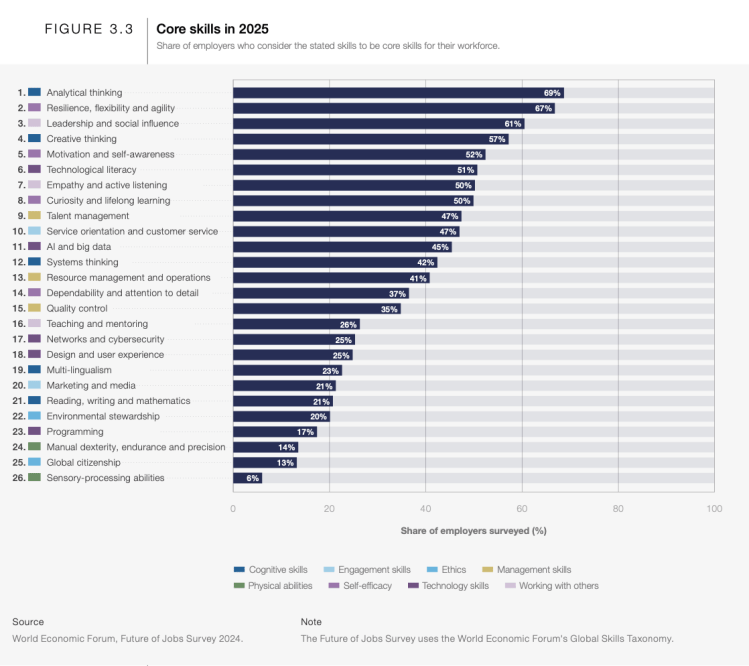 AI and big data top the list of fastest-growing skills, followed closely by networks and cybersecurity as well as technology literacy. Complementing these technology-related skills, creative thinking, resilience, flexibility and agility, along with curiosity and lifelong learning, are also expected to continue to rise in importance over the 2025-2030 period. Conversely, manual dexterity, endurance and precision stand out with notable net declines in skills demand, with 24% of respondents foreseeing a decrease in their importance.